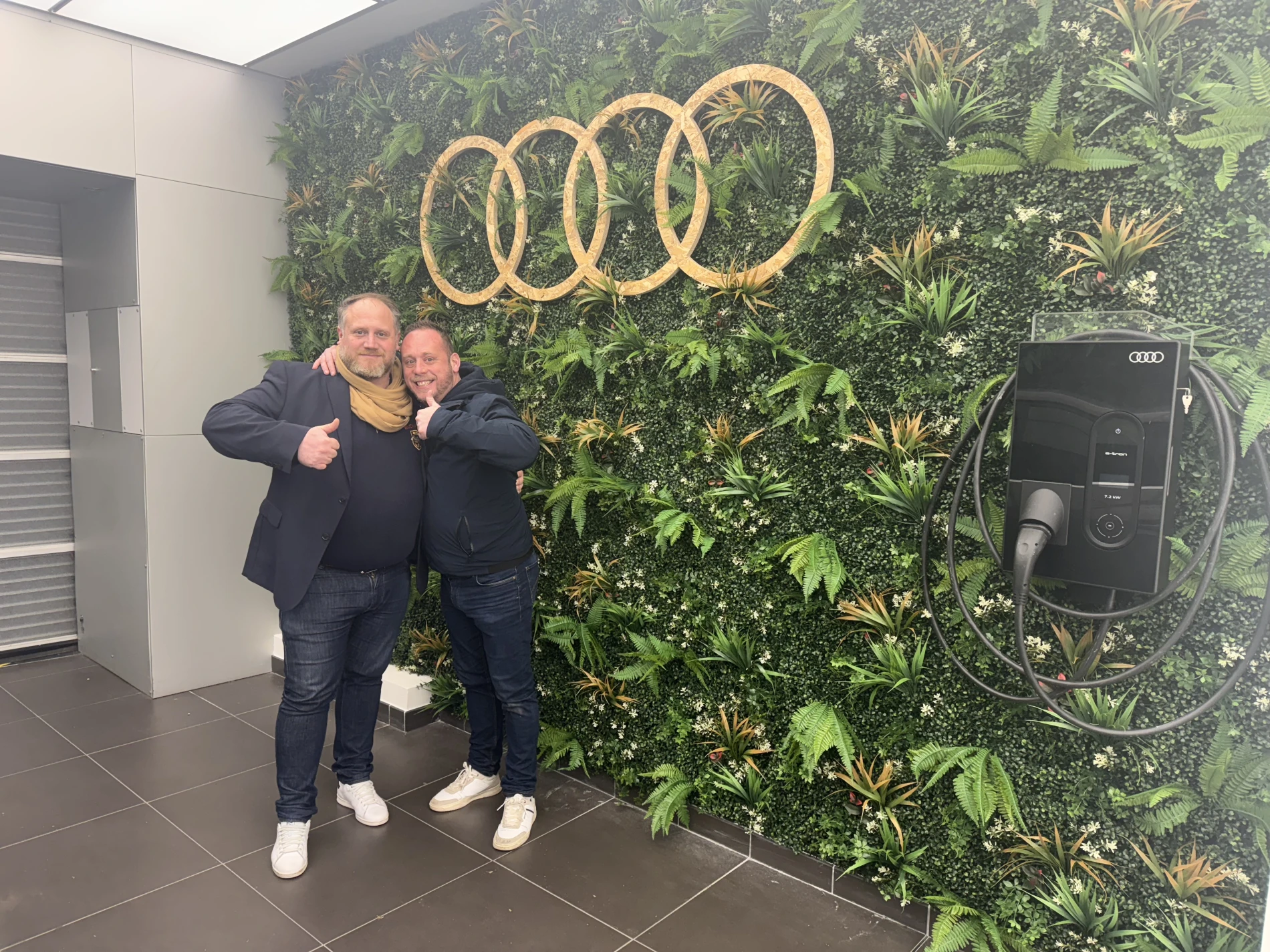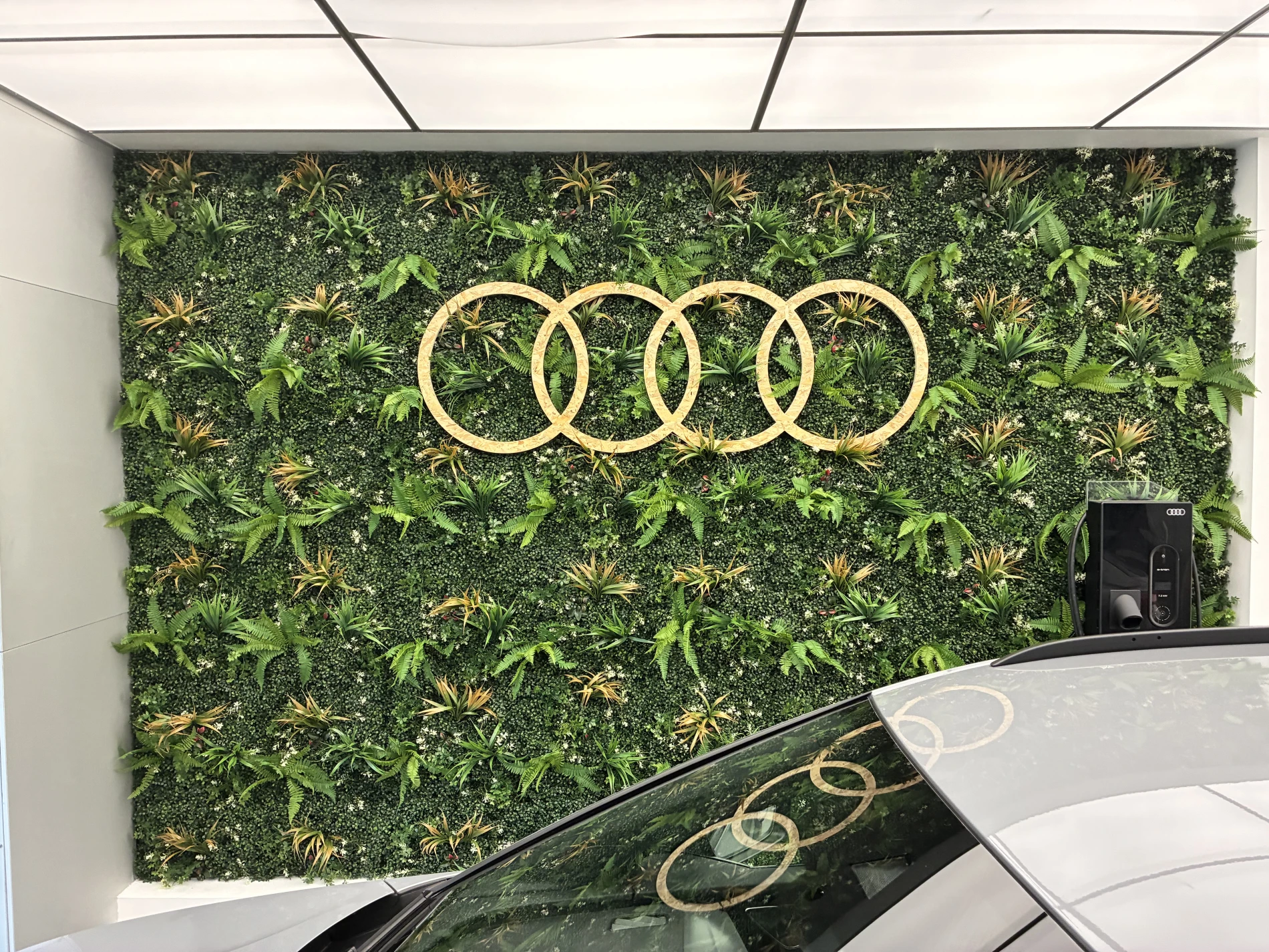 L’enseigne Audi a été découpée et fabriquée sur mesure, puis installée avec précision directement sur le mur végétalisé.